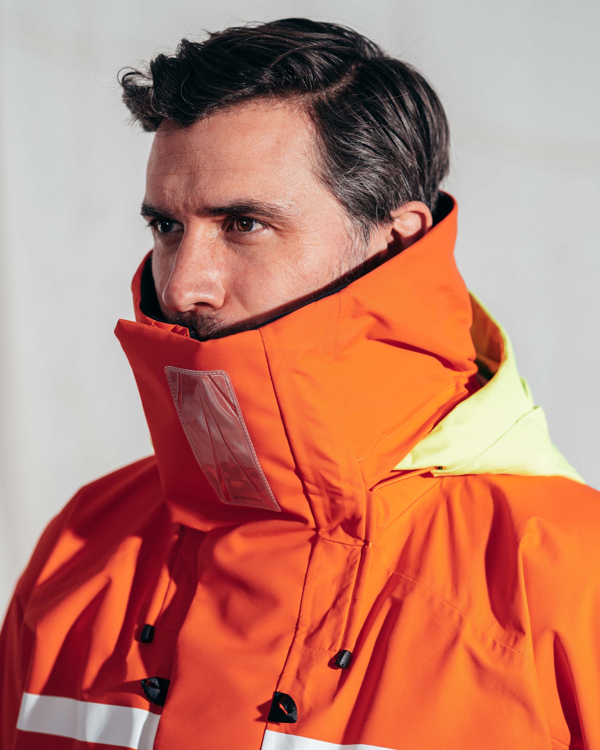 - Hi-visibility hood with integrated drainage system